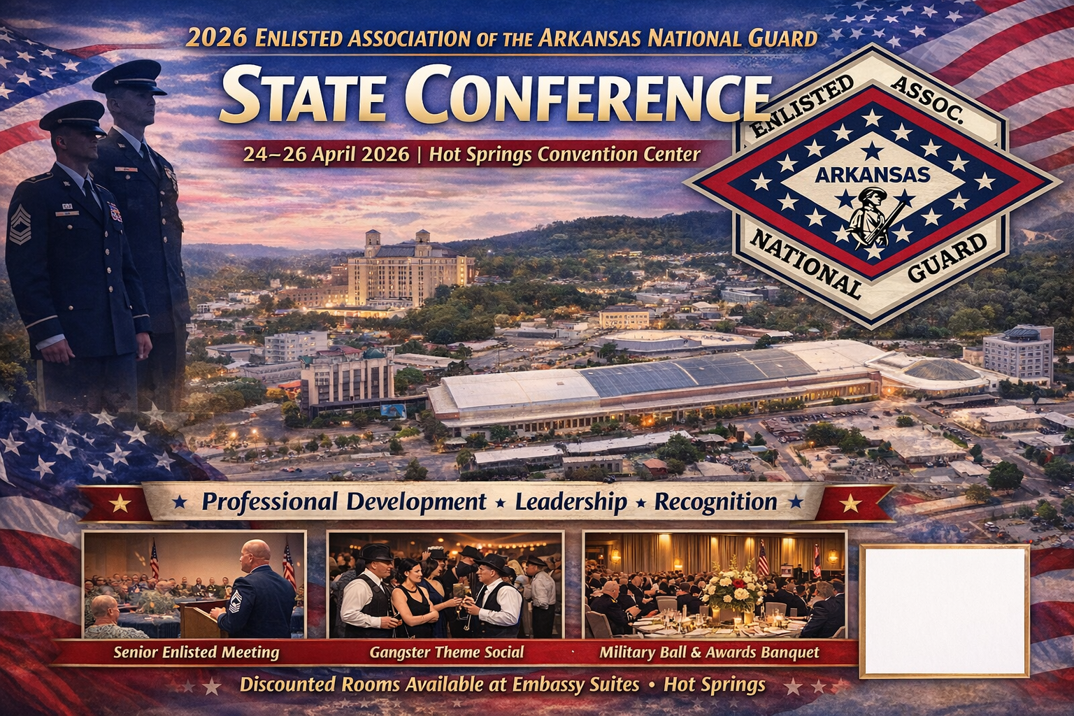 Join the Enlisted Airmen, Soldiers , Retirees, Families, and Partners of the Arkansas National Guard for a weekend of Professional development, Recognition, Networking, and Fellowship.